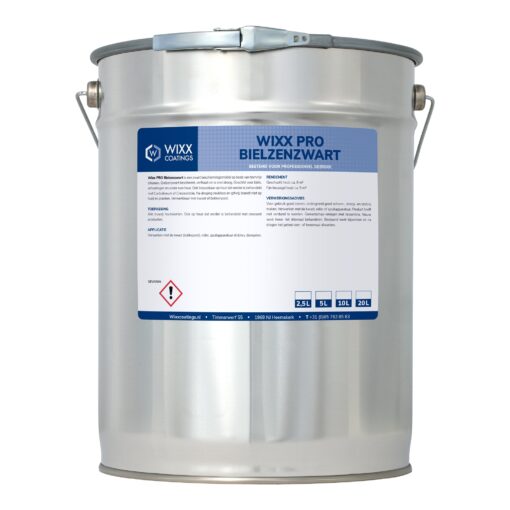 Wixx PRO bielzenzwart is een zwart beschermingsmiddel op basis van teervrije bitumen. Dit middel beschermt, verfraait en is namelijk sneldrogend. Geschikt voor biels, schoeiingen en ander ruw hout. Bovendien ook toepasbaar op hout dat eerder is behandeld met carbolineum of creosootolie. Na droging reukloos en gifvrij; brandt niet op huid en planten. Verwerkbaar met kwast of bokkenpoot.